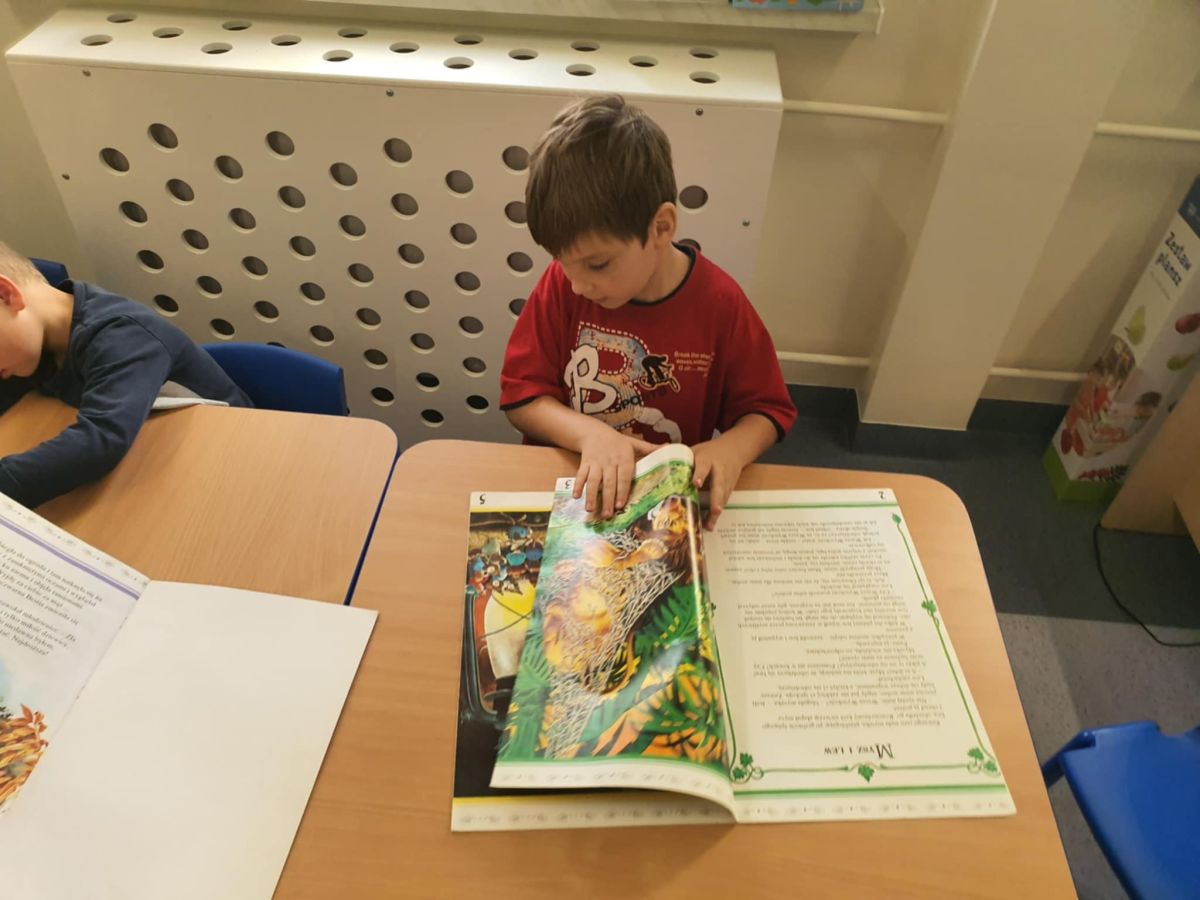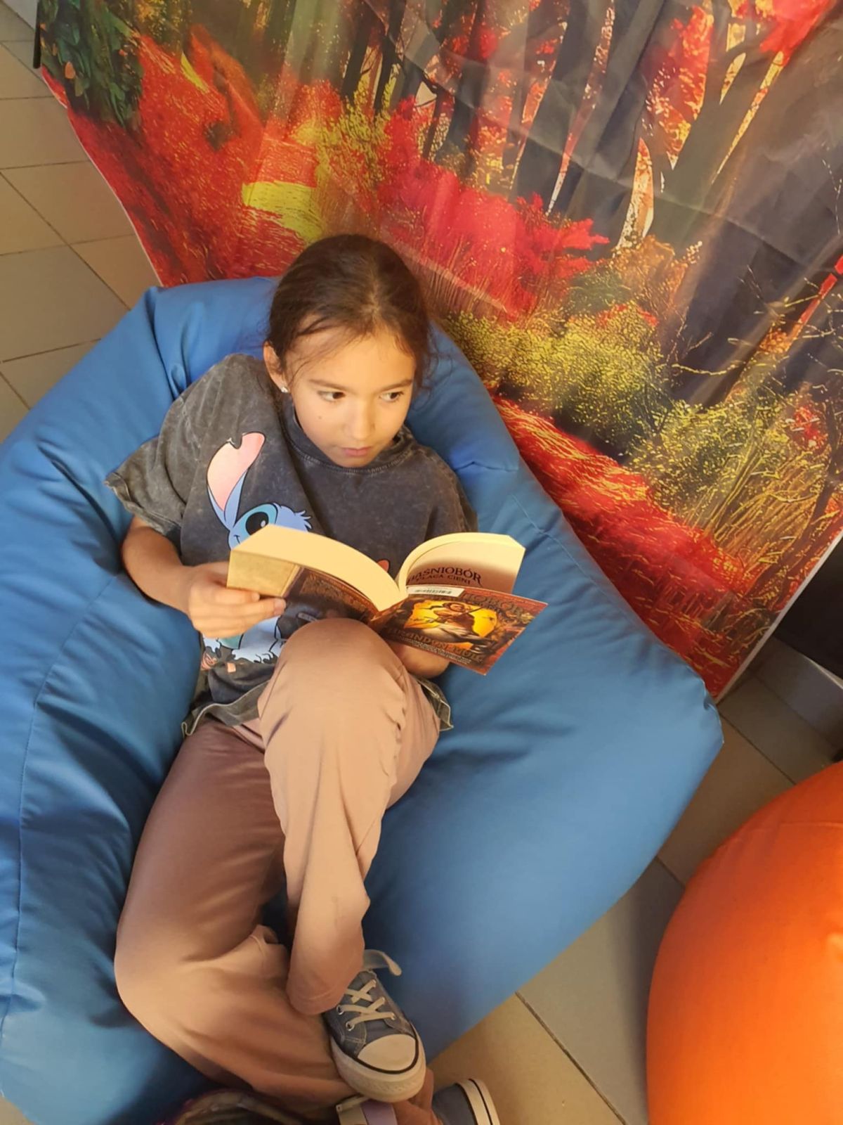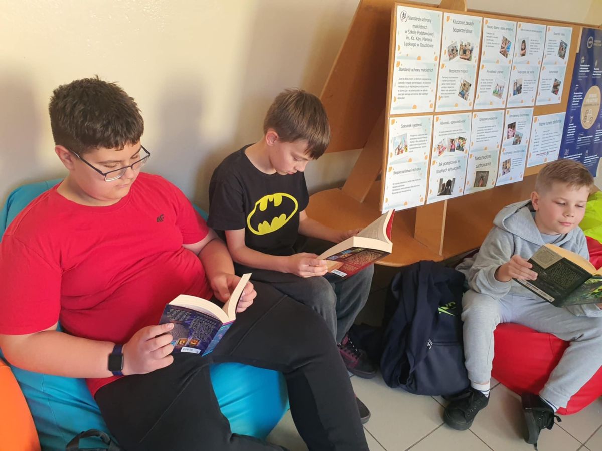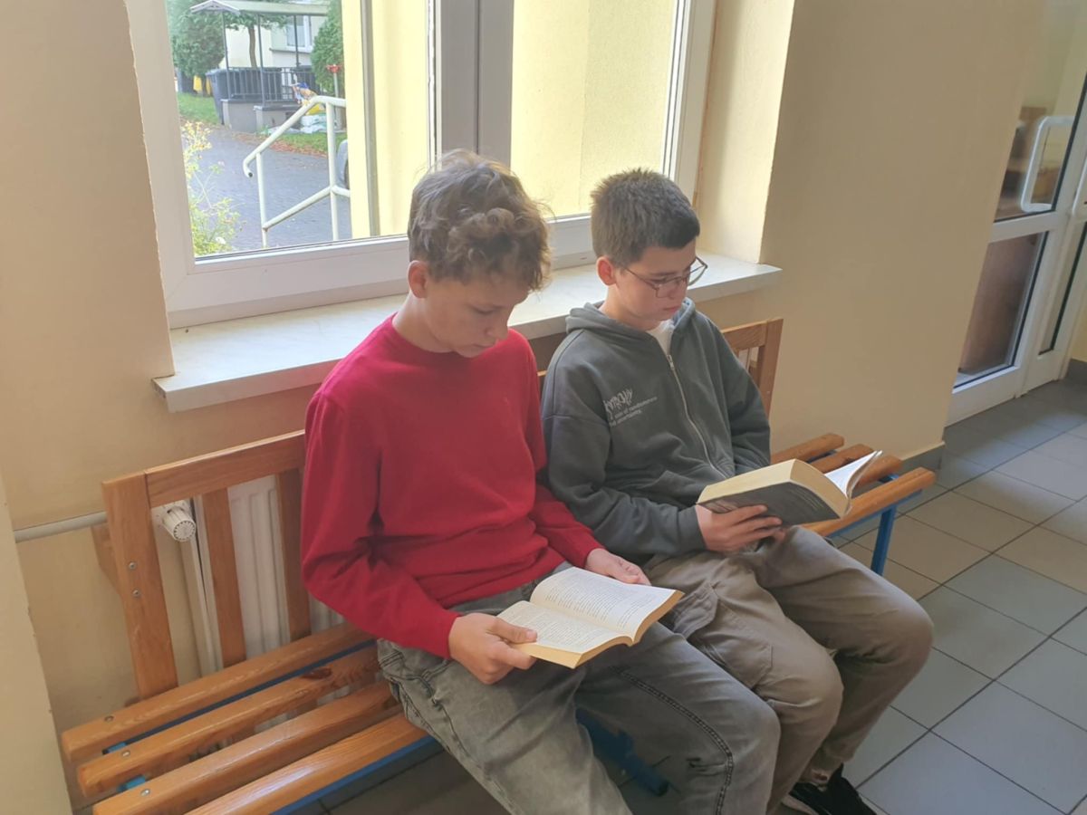 Przerwa na czytanie to jedno z wielu działań w ramach Narodowego Programu Rozwoju Czytelnictwa. Polega ono na zapewnieniu spokojnego miejsca na korytarzu szkolnym - kącika czytelniczego - przeznaczonego na czytanie wybranej przez uczniów książki. Tak też było 10 października 2025 r. Uczniowie najpierw wybrali sobie w bibliotece ciekawe pozycje książkowe, a następnie zasiedli na wygodnych pufach. W ciszy i spokoju, pochłonięci lekturą spędzili czas między lekcjami.