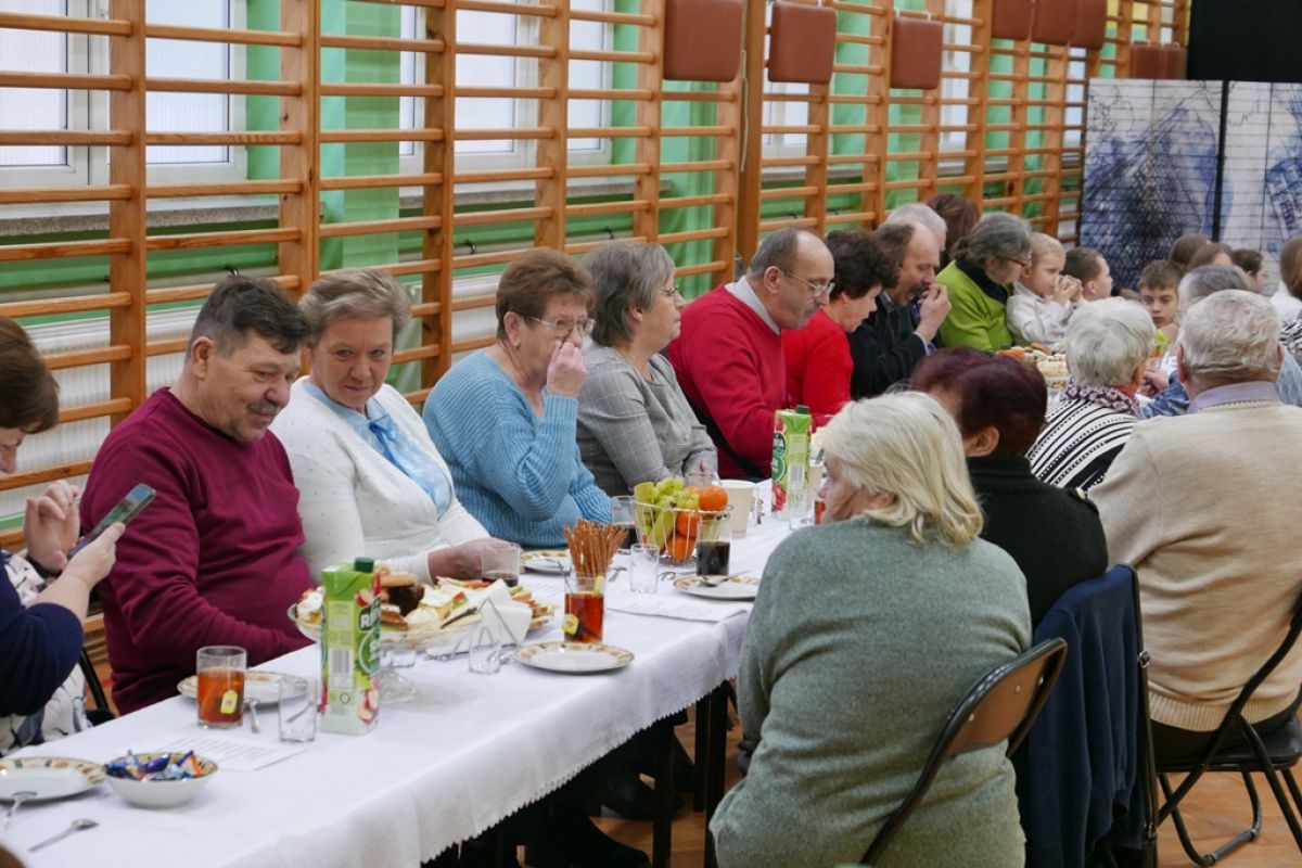 W okolicy godziny 10.00 babcie oraz dziadkowie uczniów przybyli do szkoły i udali się na salę gimnastyczną, gdzie zasiedli przy stołach, zastawionych wyśmienitym poczęstunkiem. O godzinie 10.05 Pani Urszula Gowin powitała wszystkich zebranych na sali, a następnie oddała głos najmłodszym uczniom naszej szkoły, czyli przedszkolakom. Dzieci przepięknie recytowały wierszyki oraz śpiewały piosenki związane z obchodzonym świętem. Swoje artystyczne występy zakończyły tanecznie. A wszystko w otoczeniu kosza pełnego kolorowych i bajkowych kwiatów. Mniej więcej o godzinie 10.30 scenę przejęła klasa VI, która zaśpiewała piosenkę w języku angielskim. Swoich podopiecznych przygotowała pani Anna Dębska. Później klasa VIII odegrała krótki skecz o stuletniej babci, która udzielała wywiadu dla telewizji. Klasy V i IV przygotowały dla swoich dziadków krótkie rymowanki oraz piosenki, dzięki którym widownia mogła poczuć się tak jak za czasów swojej młodości. Za program artystyczny odpowiadały panie: Aneta Piasecka, Ewa Termena, Dominika Jankowska. Dekorację przygotowała pani Angelika Woźniak. Występy zakończyły się o godzinie 12.00. Wtedy uczniowie mogli spędzić trochę czasu ze swoimi gośćmi, a następnie udać się do sali numer 9, aby razem wykonać pamiątkowe zdjęcie. W tymże pomieszczeniu pani Anna Saiki-Ossowicz przygotowała profesjonalne studio fotograficzne. Sprzęt do jego realizacji szkoła pozyskała w ramach programu Laboratoria Przyszłości. Pamiątkowe zdjęcia z seniorami zostaną wywołane i przekazane jako upominki od wnuków.